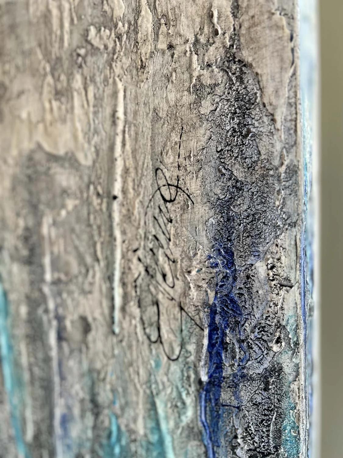 Genug der Rede, Bilder sagen ja bekanntlich mehr als 1000 Worte. Hier ein paar Fotos von der rohen Wand bis zum nach 1 Woche fertigen Kunstwerk. Dieses dunkle Blau ist eine für mich eher untypische Farbe, aber es war der Wunsch des Arztes, seine CI-Farben in das Gemälde zu integrieren. Oxidiertes Eisen schafft einen warmen Grundton und die Anbindung an den Fußboden aus Holz. Die dreidimensionalen Strukturen kommen aufgrund der optimalen Lichtverhältnisse wunderbar zur Geltung.